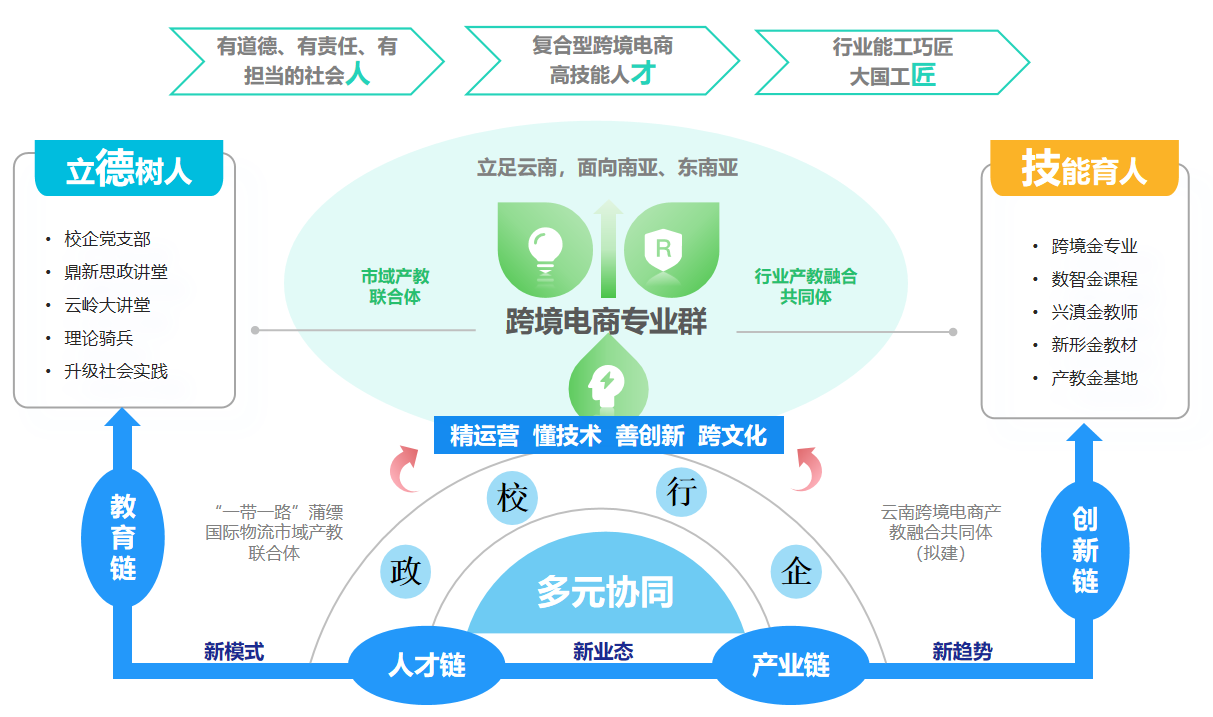 跨境服务贸易学院是学校为推进省级“双高”项目建设而成立的新型学院,以省级“双高”专业群跨境电子商务为核心,整合现代物流管理、跨境电子商务、网络营销与直播电商、关务与外贸服务等4个专业,打造兼具财经底色与云南高原特色农业、现代服务业、数字经济产业发展相适配的新型专业群。